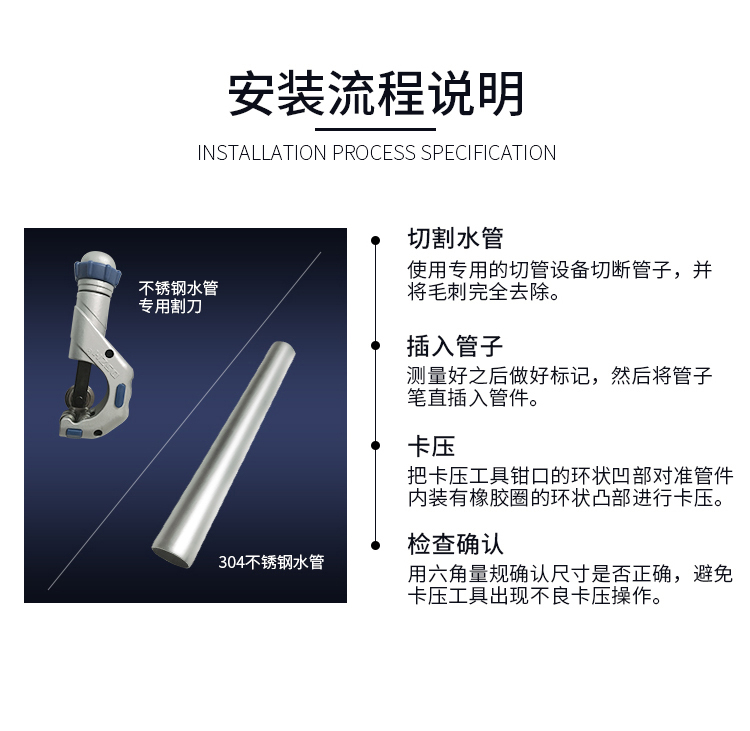 卡壓式連接~分單卡壓跟雙卡壓兩種,由德國(guó)率先垂范搭配使用的卡壓式管件,連接強(qiáng)度高,抗震動(dòng),滿(mǎn)足嵌入式安裝的要求,極大地減少了隱蔽環(huán)境中水管漏水的可能性,滿(mǎn)足了國(guó)家CECS153:2003標(biāo)準(zhǔn),適合DN15-DN100口徑管道使用,避免明火焊接操作。