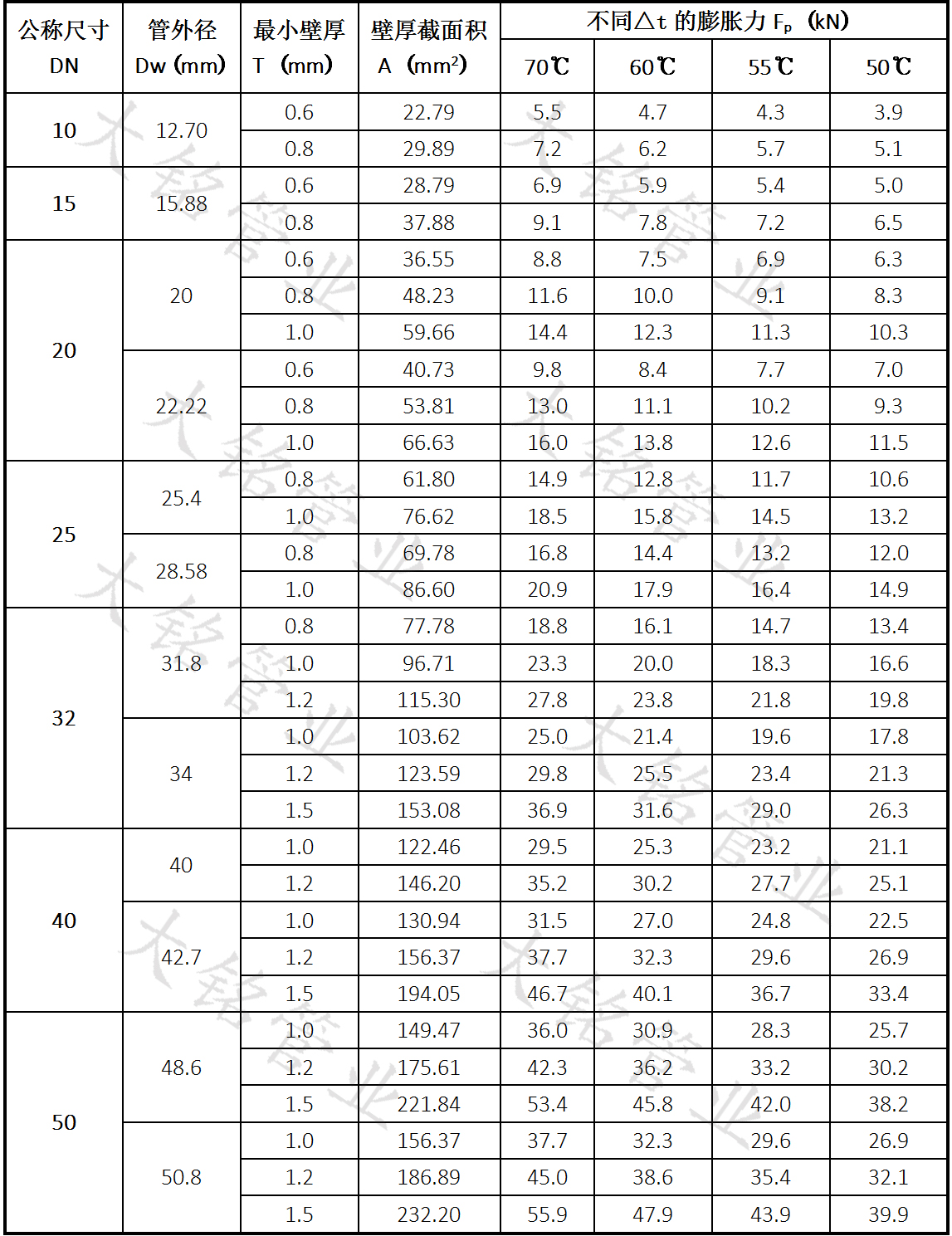 當(dāng)采用固定支架限制管道變形時,江蘇衛(wèi)生級不銹鋼熱水管道的固定支架應(yīng)按其支撐力大于因溫度變化引起的膨脹力設(shè)置。管道膨脹力按下式計算,具體見表: