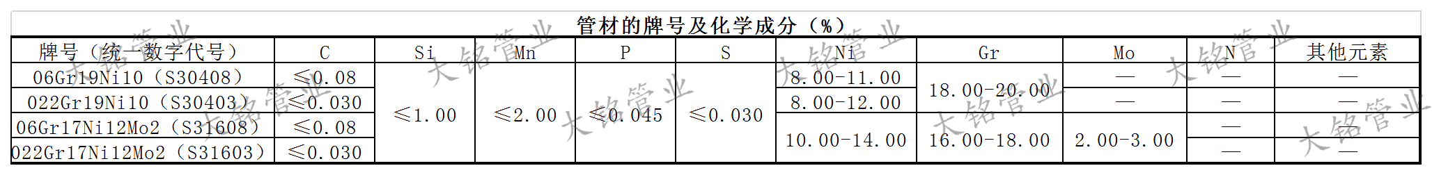 建筑給水薄壁不銹鋼管管材和管件均由含鉻(Cr)量在12%以上,并按需添加其他金屬元素所形成的奧氏體晶體結(jié)構(gòu)性質(zhì)的鐵合金。添加鎳(Ni)可提高材料的延展性和韌性,使加工易成型,宜彎曲。減少碳(C)含量,可提高材料的焊接性能。添加鉬(Mo)或錳(Mn)等含量,可提高材料的耐點(diǎn)蝕和耐縫蝕的性能。